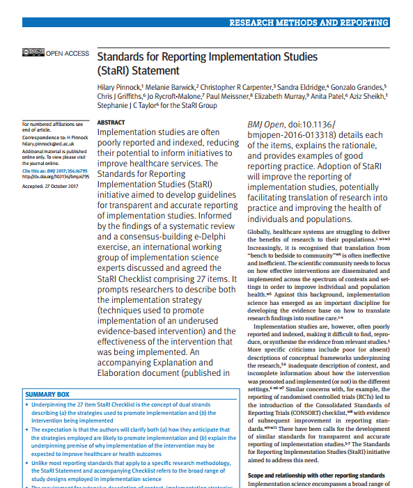 La recopilación y publicación de los estándares pretende ser un documento donde recoger las recomendaciones para la mejora y estandarización de las publicaciones sobre los estudios de investigación en implementación (“StaRI”). Se trata de una iniciativa destinada a ayudar a los investigadores a que elaboren informes transparentes y precisos de los estudios ejecutados e implementados.