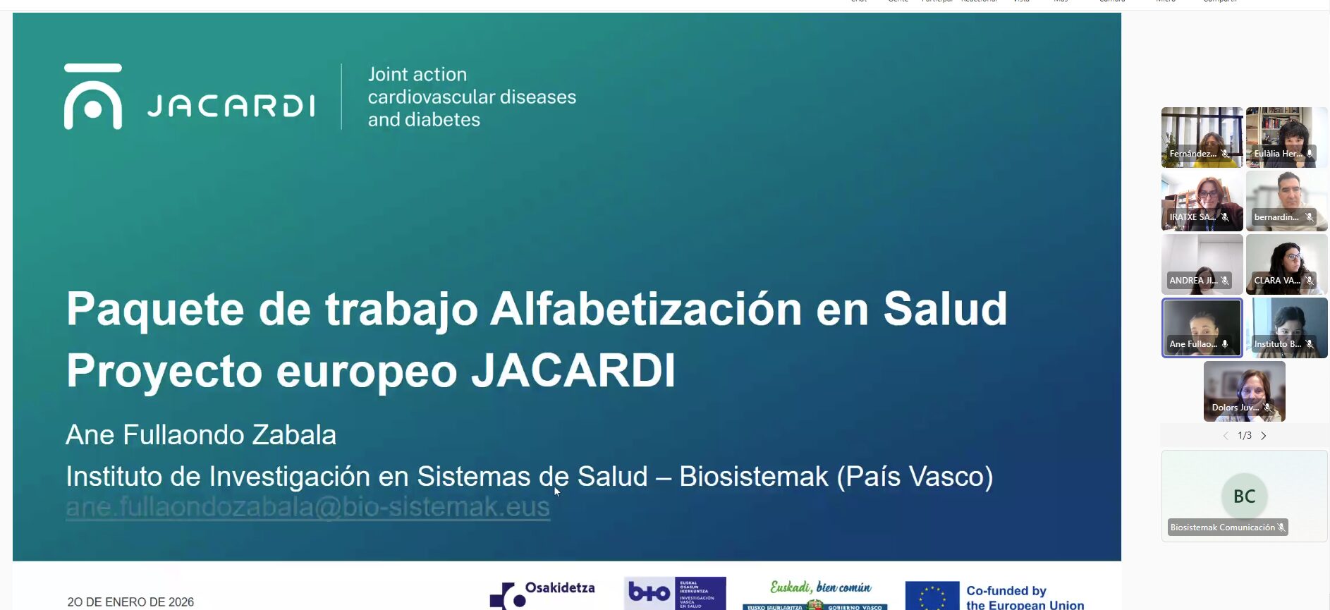 On 20 January, Biosistemak, together with Osakidetza’s Primary Care Coordination team, represented by Iratxe Salcedo and Clara Val, presented the work carried out within the framework of the European JACARDI project to the Ministry of Health. The project focuses on improving health literacy among adolescents and young people in the Basque Country.