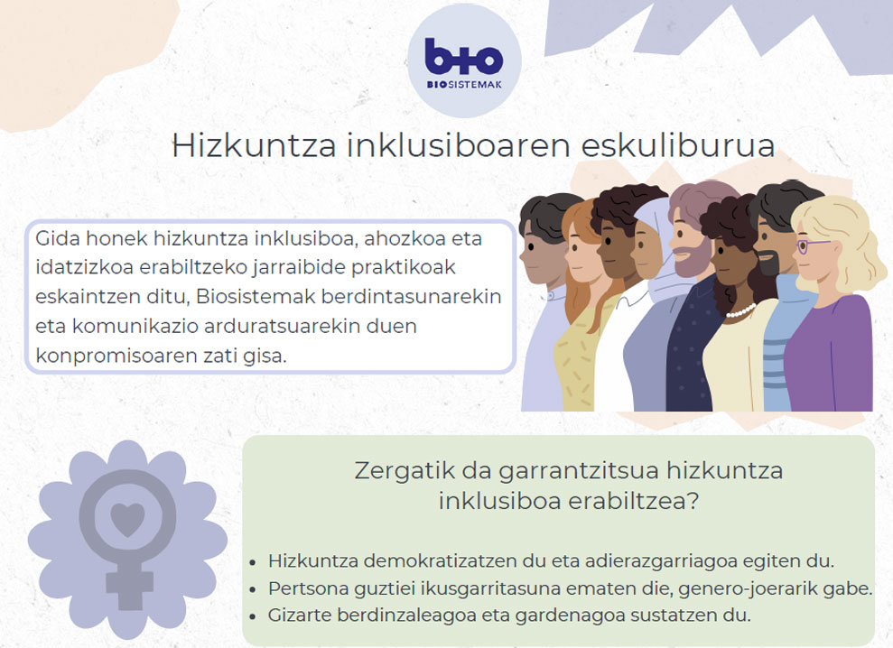 Gida honek hizkuntza inklusiboa, ahozkoa eta idatzizkoa erabiltzeko jarraibide praktikoak eskaintzen ditu.