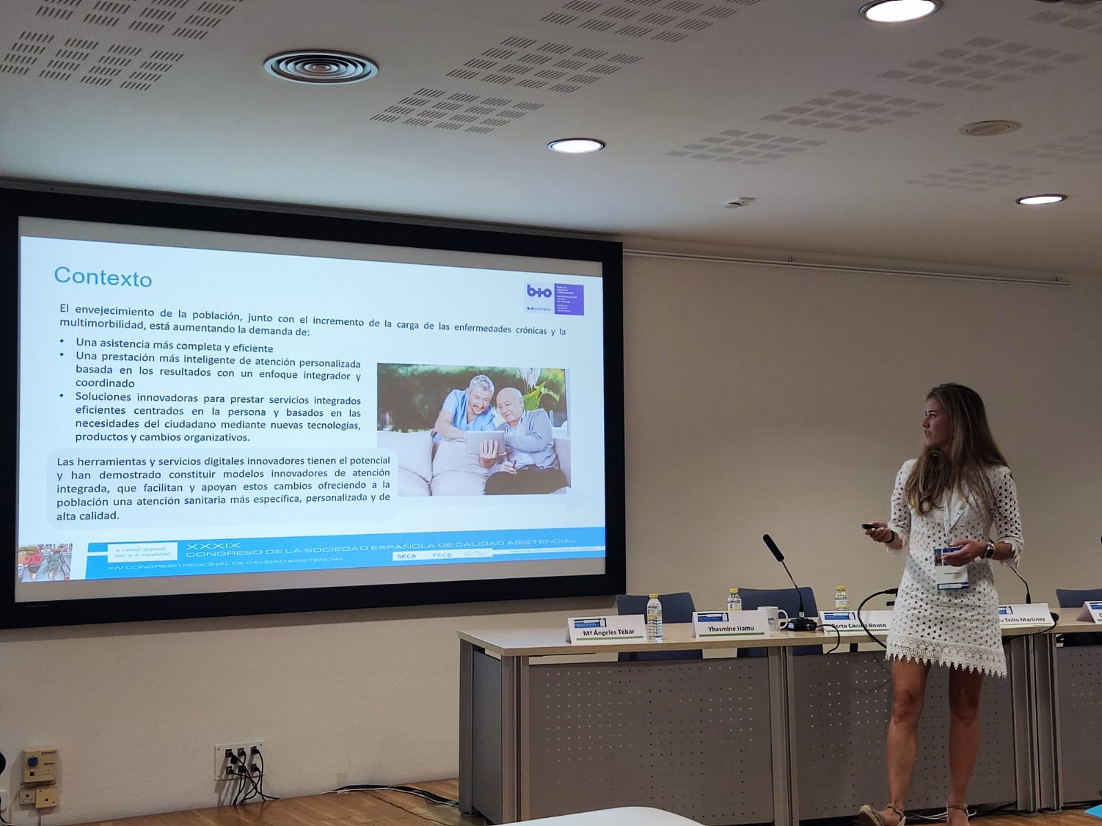 - Mesa mejores comunicaciones área temática “Gestión de la calidad” – Título: “Implementación de soluciones asistenciales integradas centradas en la persona y habilitadas digitalmente – JADECARE – Comunicación oral larga realizada por Yhasmine Hamu Azcárate (Investigadora y gestora de proyectos)