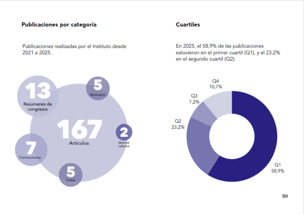 En el ámbito de la producción científica, en 2025 alcanzamos un total de 56 publicaciones científicas, con un Factor de Impacto Acumulado (FIA) de 238,4, y participamos con 21 ponencias en congresos nacionales e internacionales. Estos resultados refuerzan nuestro compromiso con la excelencia científica, la transferencia de conocimiento y el impacto real en la práctica y las políticas sanitarias.