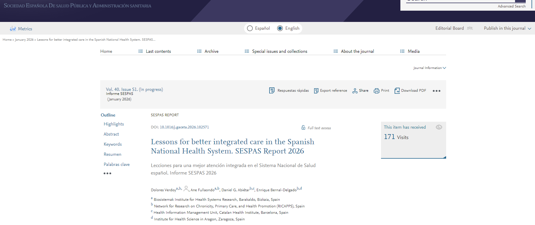 El artículo se enmarca en el Informe de la Sociedad Española de Salud Pública y Administración Sanitaria (SESPAS) 2026 y está firmado por Dolores Verdoy y Ane Fullaondo, de Biosistemak, en colaboración con Daniel G. Abiétar, del Institut Català de la Salut (ICS), y Enrique Bernal‑Delgado, del Instituto Aragonés de Ciencias de la Salud (IACS). Todas las personas autoras participan, además, en la Red de Investigación en Cronicidad, Atención Primaria y Promoción de la Salud (RICAPPS).